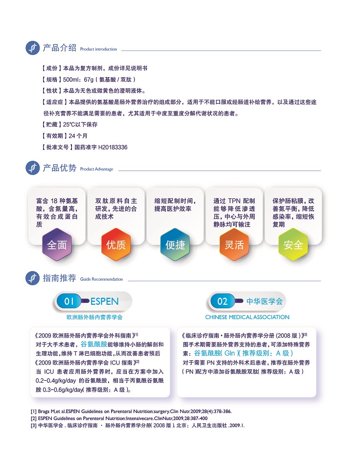 【適 應(yīng) 癥】本品提供的氨基酸是腸外營養(yǎng)治療的組成部分,適用于不能口服或經(jīng)腸道補(bǔ)給營養(yǎng),以及通過這些途徑補(bǔ)充營養(yǎng)不能滿足需求的患者,尤其適用于中度至重度分解代謝狀況的患者。