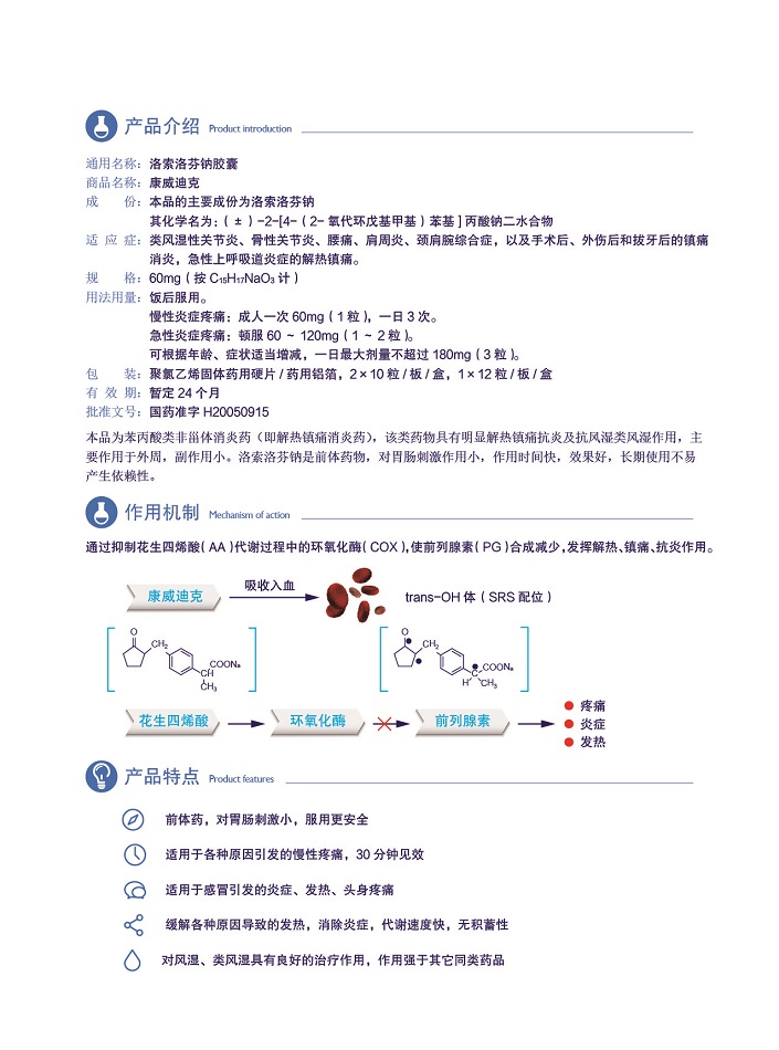 【成  份】:本品的主要成份為洛索洛芬鈉。其化學(xué)名為:(±)-2- [4-(2-氧代環(huán)戊基甲基)苯基]丙酸鈉二水合物